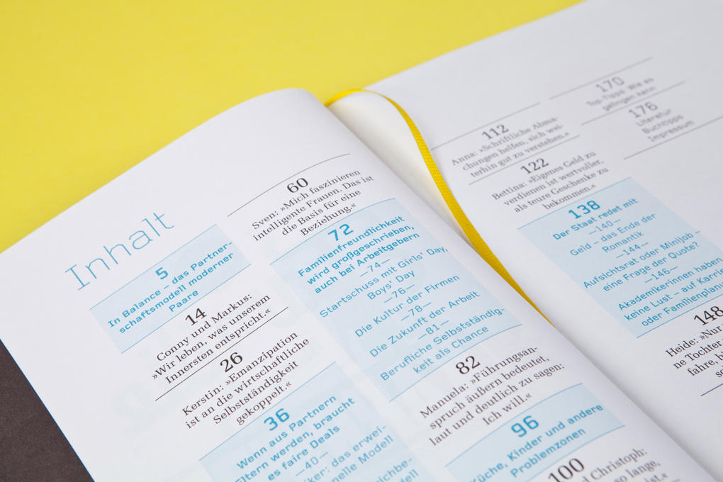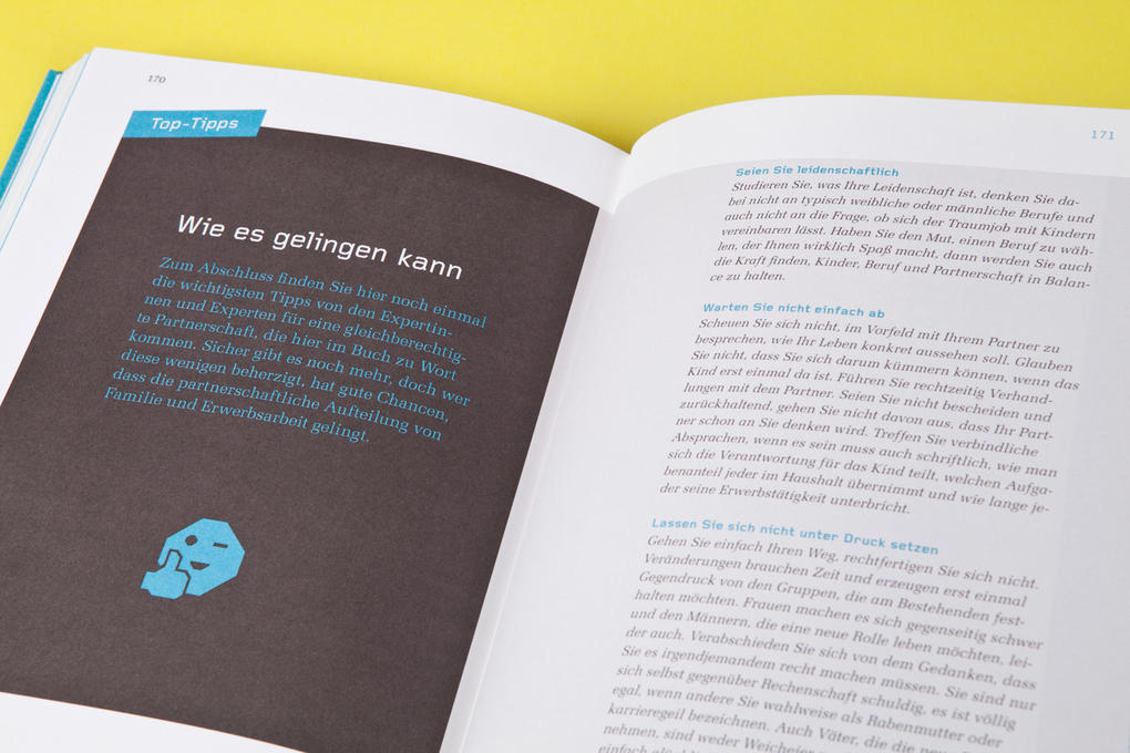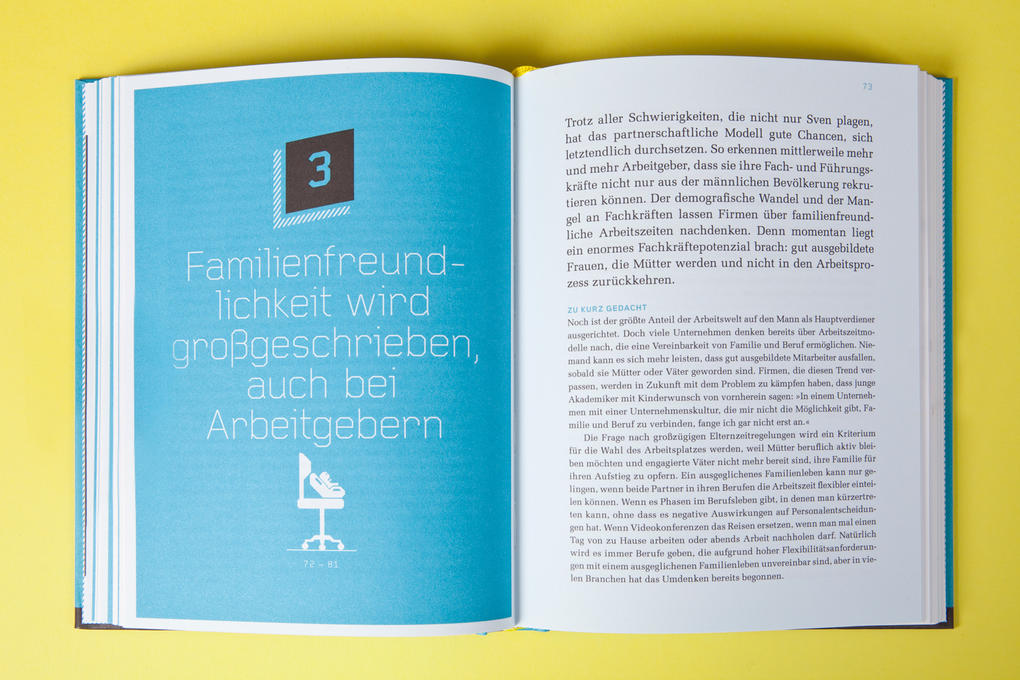 Familie und Karriere spielen nicht immer pauschal gegeneinander. Dieses Buch offenbart, dass es definitiv anders geht, aufgrund von verstärkter Familienfreundlichkeit in Unternehmen und modern gelebten Alternativen zum traditionellen Rollenmodell. Die besten Tipps ein Dream-Team zu werden bezüglich des parallelen Karriere- und Familien-Handlings, umfasst dieses im Gatzanis Verlag entstandene Buch. Studio GOOD übernahm die gesamte Buchgestaltung, innenbegriffen der Illustrierten Cover und Kapitelseiten.