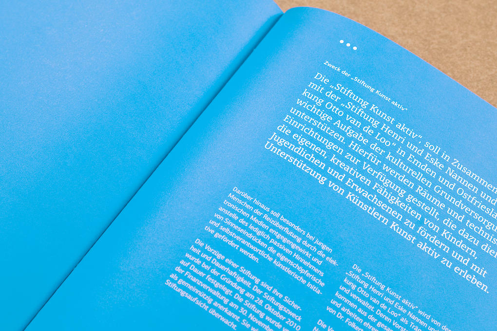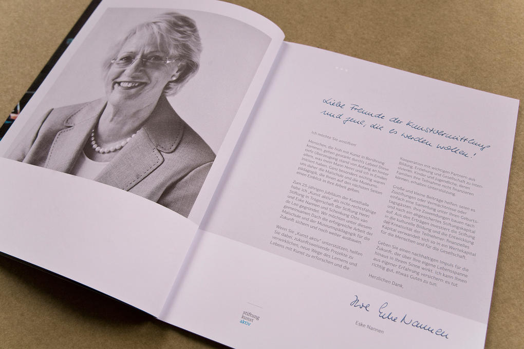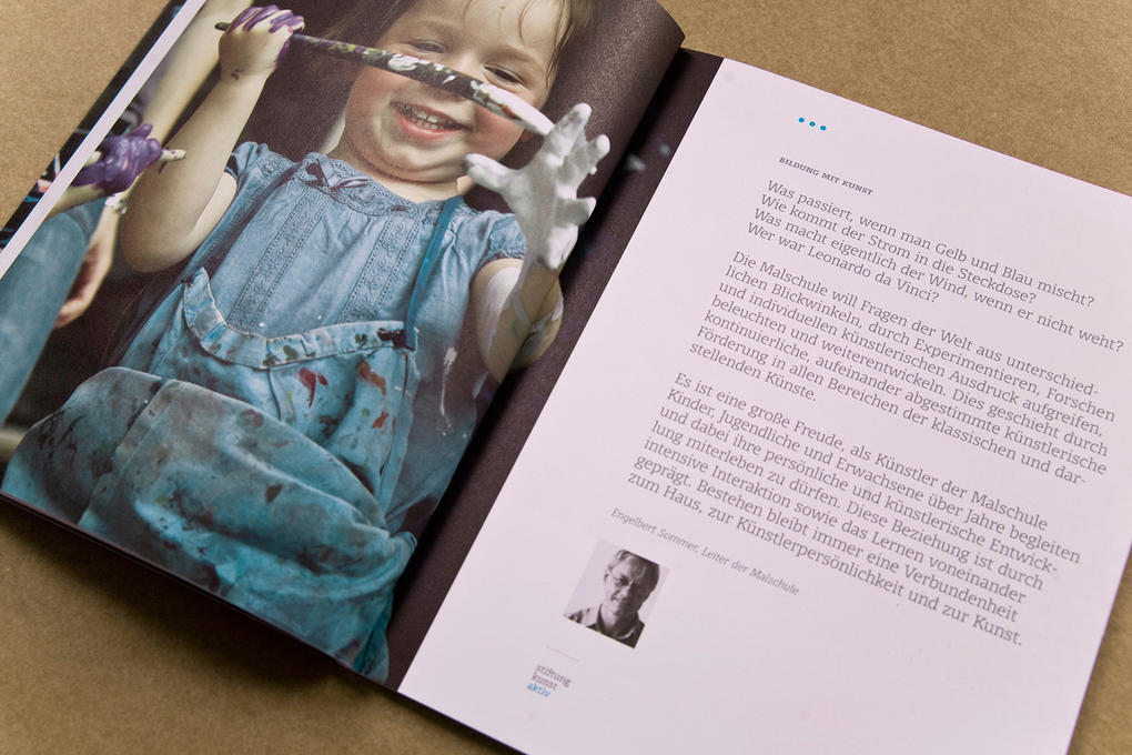 Schon mit der Eröffnung der Kunsthalle Emden rief Henri Nannen auch die Malschule ins Leben. Seit mehr als 25 Jahren widmet sich die Kunsthalle mit der Malschule und der Museumspädagogik der Kunstvermittlung für Jung & Alt und ist damit eine der ältesten Einrichtungen ihrer Art. Nicht nur Helmut Schmidt, der das Vorwort zur Imagepublikation "Stiftung Kunst aktiv – Ziele/Fördermöglichkeiten/Impressionen" beisteuerte, weiß dies zu würdigen. Eine Fotostrecke mit Porträts ehemaliger und aktiver Teilnehmer/innen mit passenden Statements unterstreicht die Sinnhaftigkeit und die bisherigen Errungenschaften der Stiftung Kunst aktiv.
