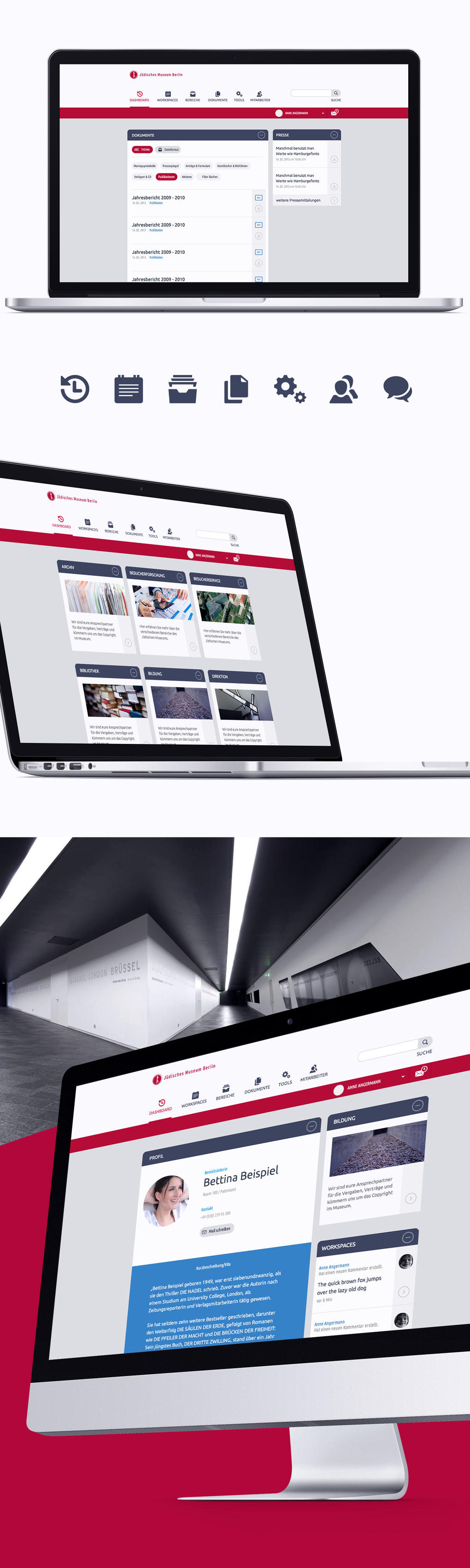 Das bedarf einer internen Plattform, die die interne Kommunikation fördert um Arbeitsabläufe zu optimieren. Unsere Aufgabe war es bei dieser Gelegenheit ein Intranet für das Jüdische Museum zu schaffen, das dieses Ziel plus zusätzliche Nutzen mit sich bringt. Nach mehreren internen und bereichsübergreifenden Workshops und gemeinsamen Testphasen stellten wir ein komplett individualisiertes und schickes System auf die Beine, das den Anreiz besitzt, wirklich täglich von den Mitarbeitern genutzt zu werden. Eine benutzerfreundliche, ästhetische Oberfläche bildet den Rahmen und wird lebendig durch Projekträume, die auch Unterhaltungen mit externen Leuten ermöglichen, ein schwarzes Brett zum privaten Austausch der Mitarbeiter, die Einbindung des Jüdischen Kalenders und vielen weiteren Projektmangament-Tools.